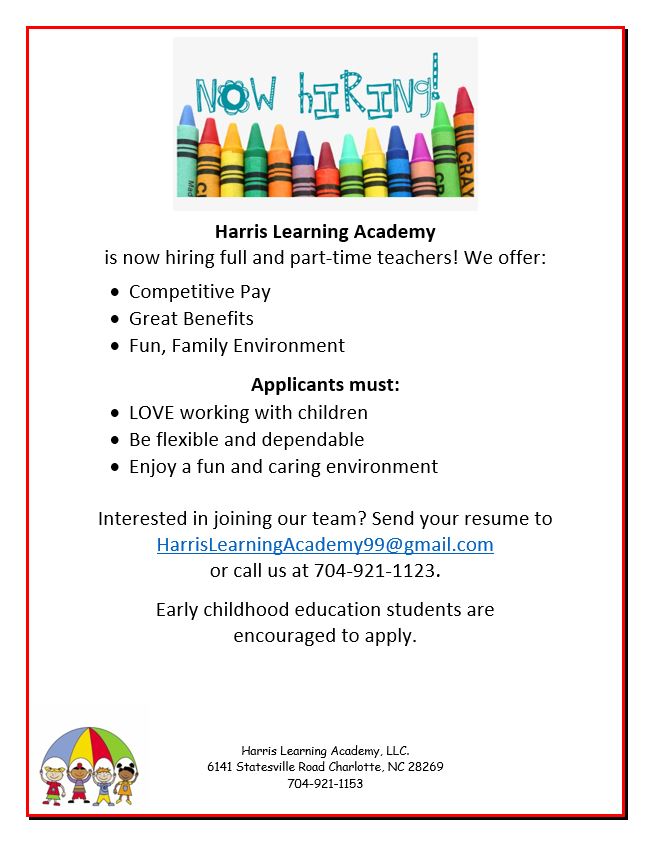 Welcome to Harris Learning Academy LLC, your premier children's daycare in Charlotte, NC! We provide a safe, fun, educational space for your children to spend the day. Caring and learning go hand in hand. We offer quality early childhood education through our childcare programs. We help Pre-K children develop physical, social, emotional, and cognitive personal aspects, allowing your child to grow and develop by providing a warm and loving experience at our school.